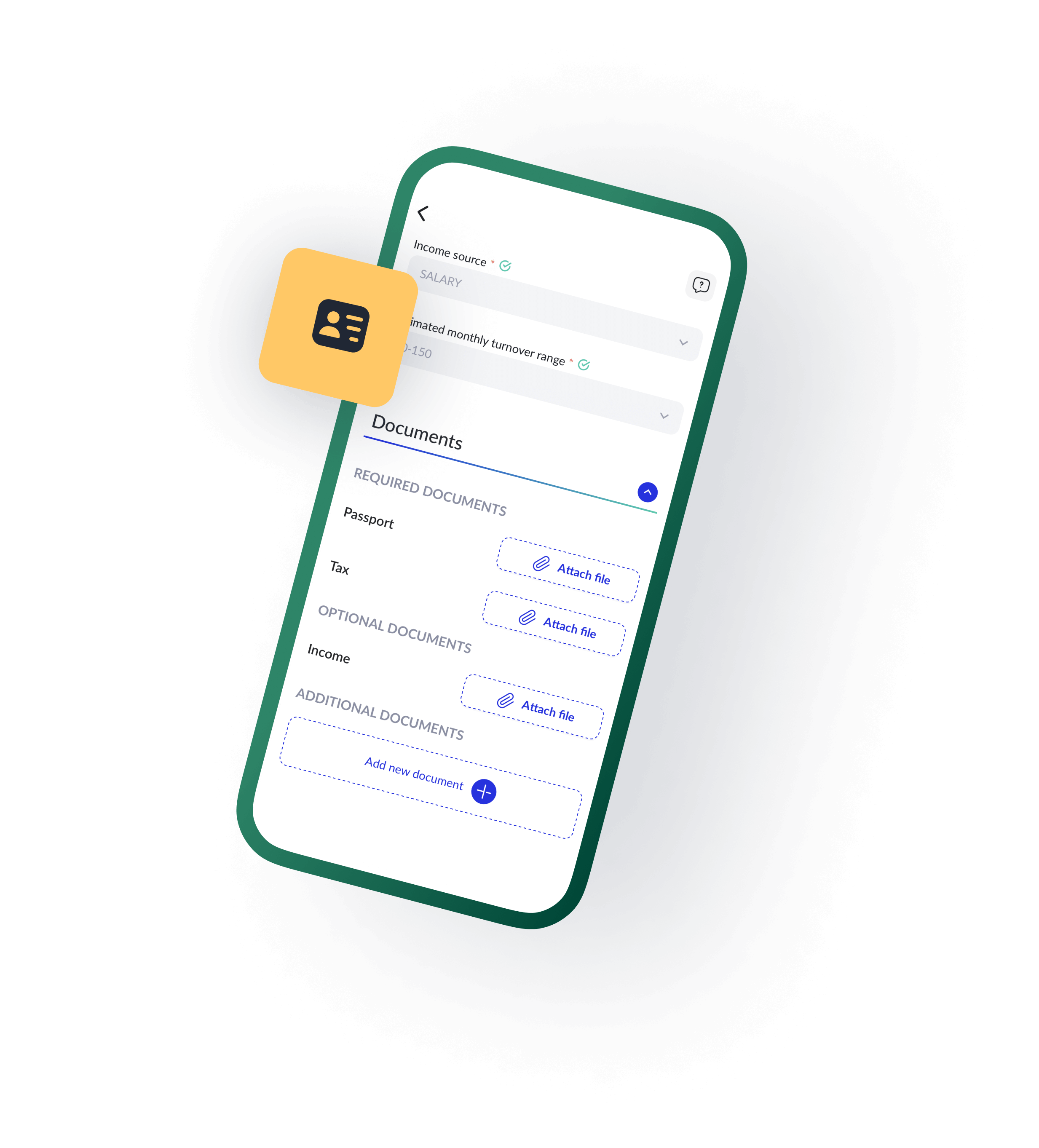 Use our automated KYC onboarding tool uniting cutting-edge third-party identification and screening services to automate AML compliance and gather all the necessary data for merchant account opening and card issuing.